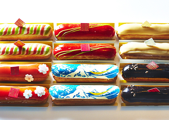 色とりどりのエクレアが並ぶなか、なんといってもまず目をひくのは「エクレール ラ・ヴァーグ」(525円)だろう。葛飾北斎の富嶽三十六景をプリントしたチョコレートがのったこの斬新なエクレアは、本店のあるパリでも人気だとか。