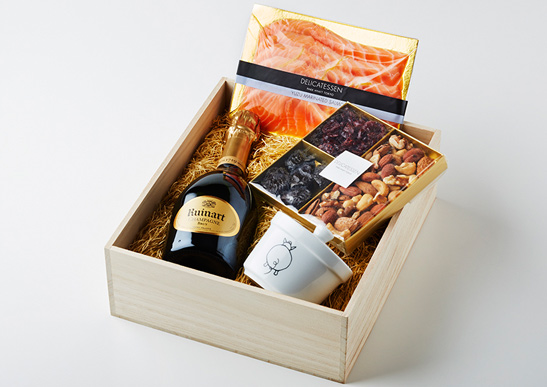 デリカテッセンで長年ベストセラーのポークリエット、爽やかな柚子を効かせたスモークサーモン、風味豊かなドライフルーツとナッツに、シャンパン「アール ド ルイナール」をあわせた。