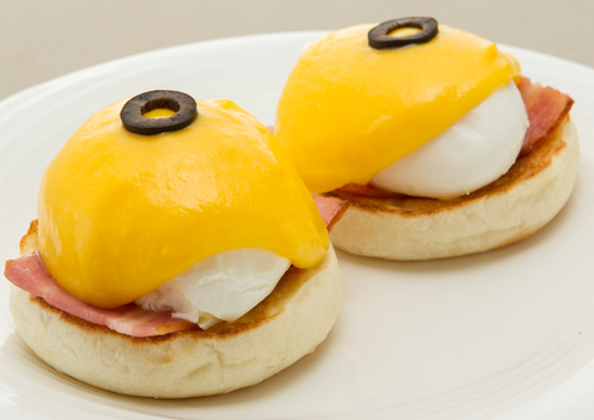 5.イングリッシュマフィンを横半分に切り、トーストする。バターを塗り、焼いたベーコンをのせ、あらかじめ作っておいたポーチドエッグをのせる。たまごの上からオランデーズソースをかけ、黒オリーブを飾る。