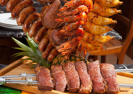 『リオ グランデ グリル』の夜メニューは、シュラスコのみ!牛、豚、鶏の各種串焼き肉と50種類のビュッフェが食べ放題。